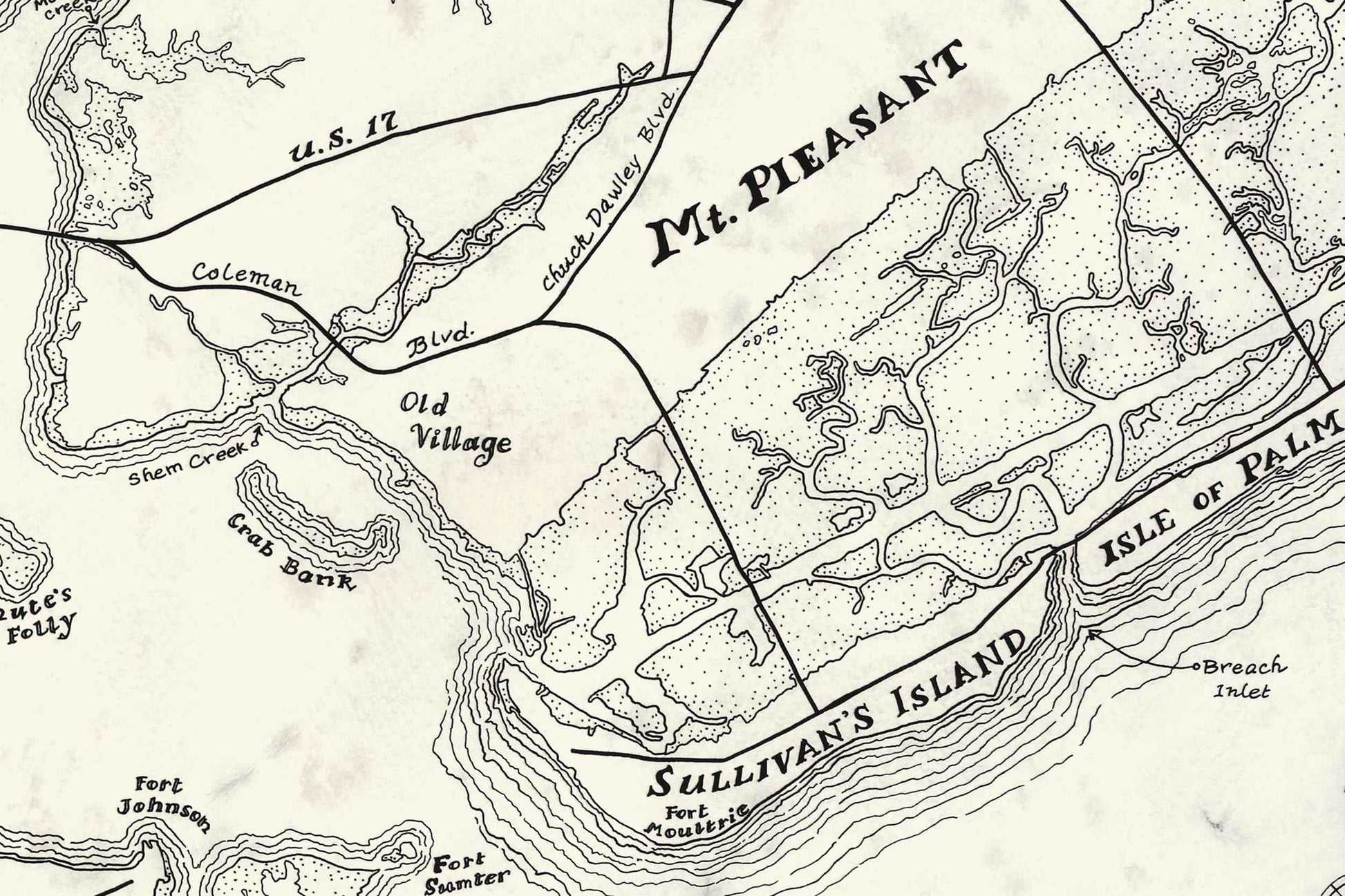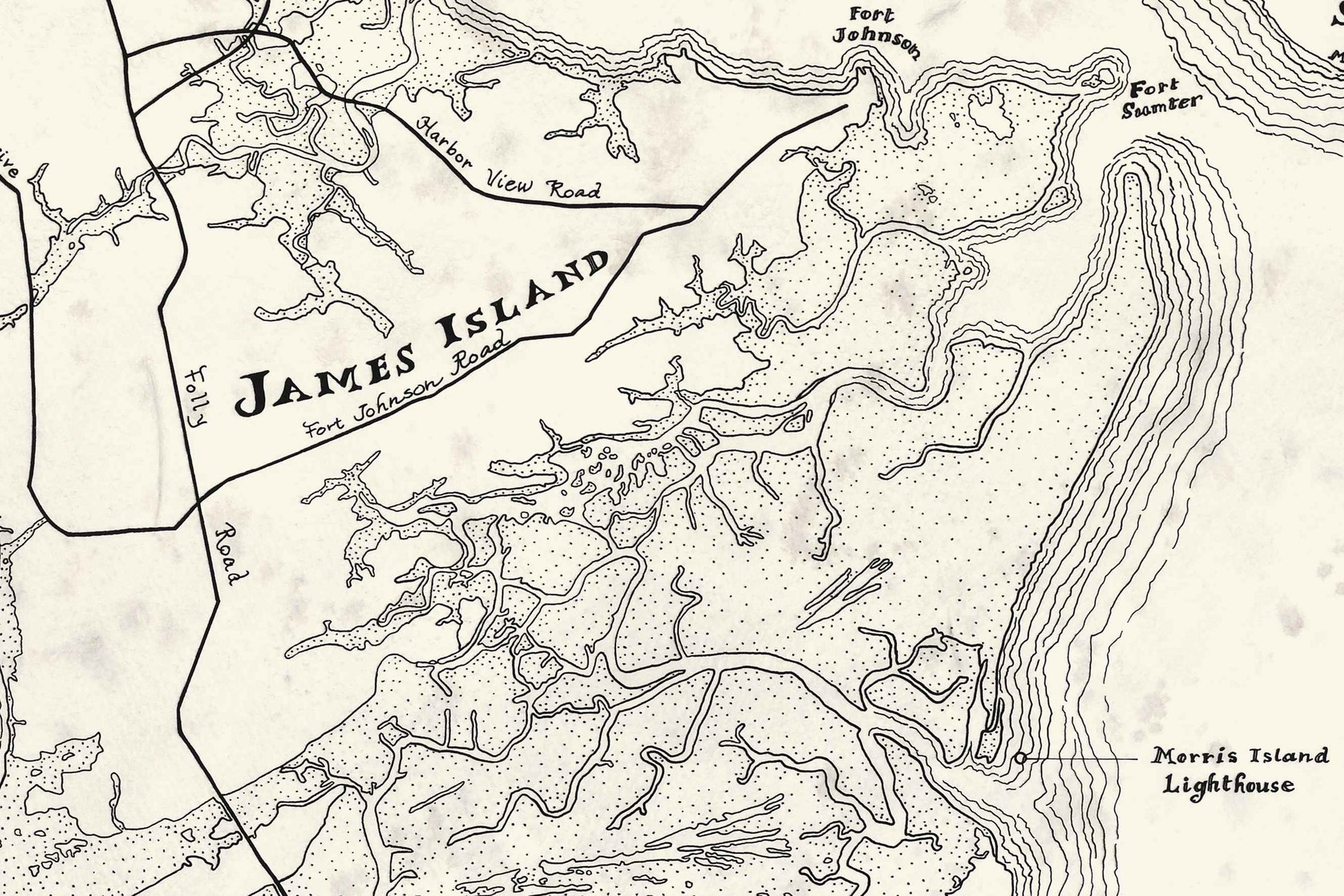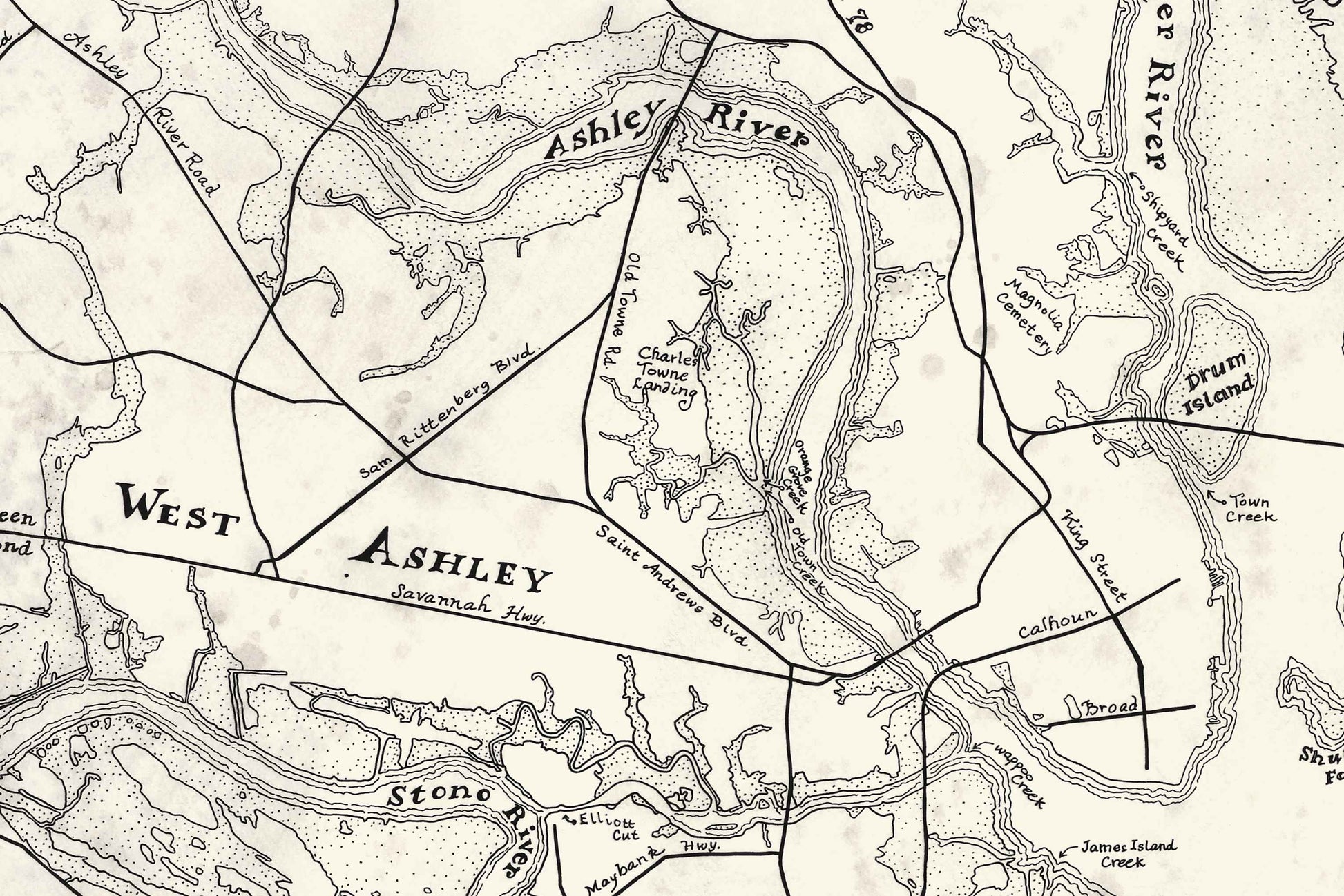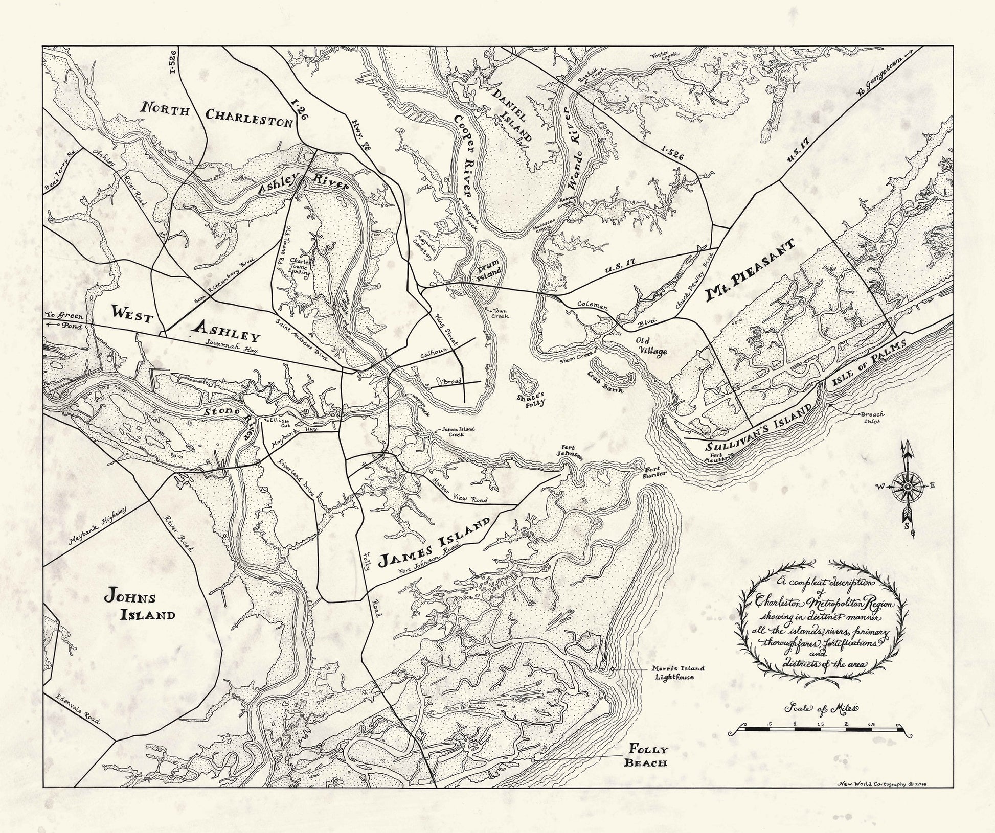 I have an 1835 map in my office of Charleston and the surrounding islands. It has always amazed me how many of those old roads are still in use today. This older map was our design inspiration for this map yet with updated thoroughfares.
