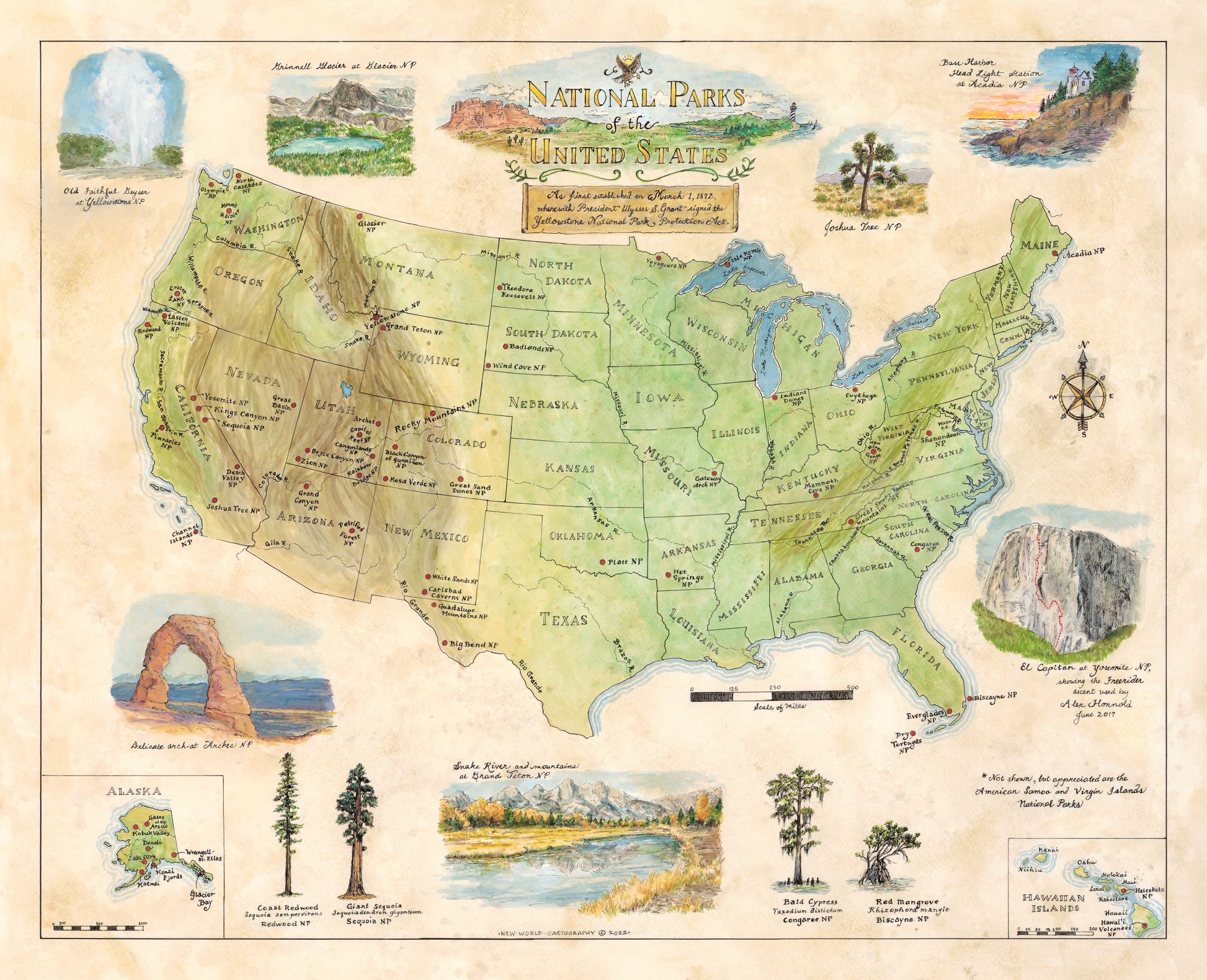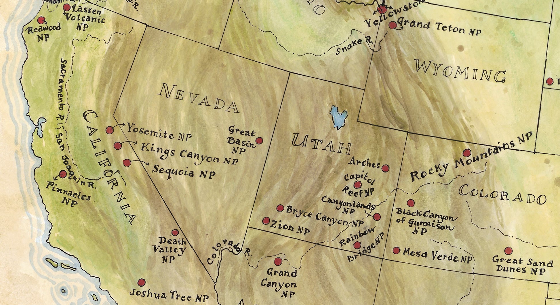 Some of my fondest childhood memories are of family road trips out West to places like Arches, Grand Canyon, and Mesa Verde. I still remember the first time I saw the Tetons. I thought I could have sat in the valley all day and stared at those peaks. We celebrate with this map one of the our country's greatest contributions to public life, National Parks.